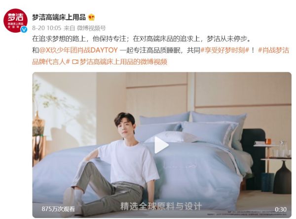 根据全国大型零售企业商品销售调查统计,由中华全国商业信息中心、中国商业联合会认证,梦洁已连续12年(2009-2020)高端床上用品位列同类产品市场销量第一,是中国高端床品行业的领军品牌。而代言人肖战作为中国大陆最具影响力的男艺人之一,两者的联合,极大提升了行业、大众对品牌高端化进程的期待。