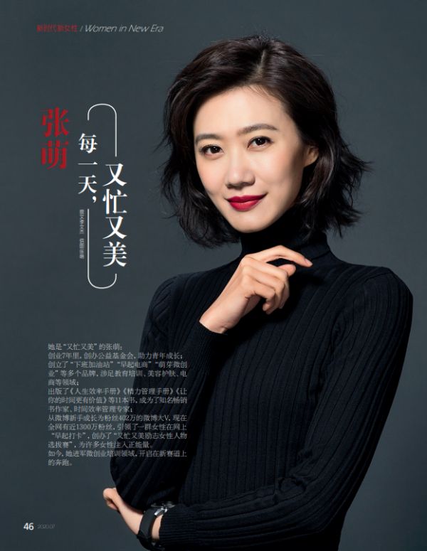 在《中国女性》的这篇专访中,张萌萌姐谈到自己人生的“难关”,她实践并验证了自己所推崇的时间管理之“目标性法则”:制定一个具体目标,目标是可衡量、可实现的,制定与目标相关的计划,设定时间去推进目标的完成。“如果你掌握了这项法则,就会发现时间管理能力显著提升,你就会像变了一个人似的。”张萌在她《人生效率手册》一书中这样写道。