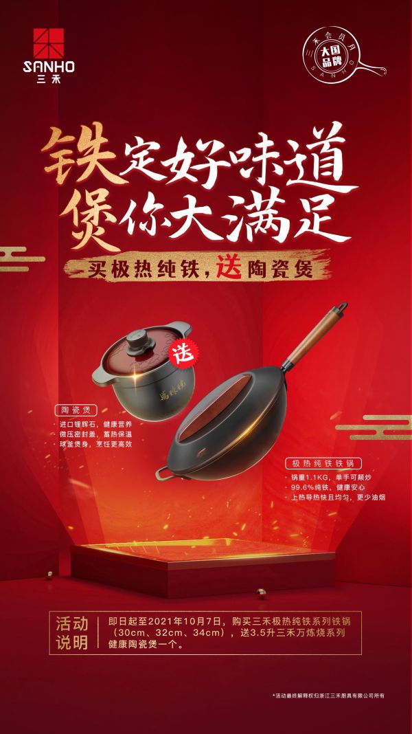 当前研发的极热纯铁轻炒锅,不仅解决了消费者的选择难题,也让烟火气成功留存在了人们的生活当中。在2021年8月18日至10月7日,三禾锅具部分线下门店购入极热纯铁健康轻炒锅即享“买一送一”专属优惠活动,买铁锅送三禾万炼烧系列陶瓷煲,守护烹饪健康。(具体活动以实际门店为准)