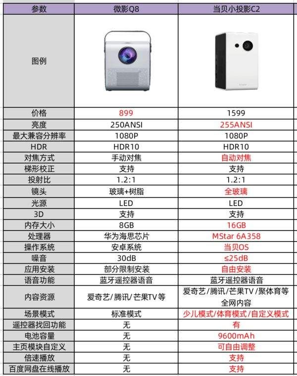 在参数上,小编个人把这款微影Q8和当贝C2做了一个比较,大家可以直接看参数。