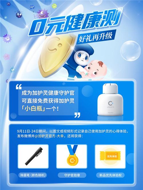 9月4日至9月10日,加护灵在微博、小红书平台发起“加护灵健康守护官”招募计划,鼓励网友分享预防流感小妙招,截图私信加护灵官方,即有有机会成为加护灵健康守护官,免费参与0元体验活动,获得价值198元的加护灵放置型小白瓶一个,亲身体验加护灵带来的洁净卫生的居住空间。