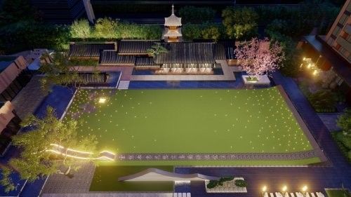 造园是建筑与地理融合的浑然天成,在唐延路畔,万瑞府景观团队精研《千里江山图》山峦走势,融贯秦岭山脉的自然起伏,衍生为园中自在绵延的山形小品。日落时分,点点星光微微闪耀,整片草坪如同卷轴般伸展,末端一侧扬起,水系由此顺势落下,干净澄澈,简约自然。