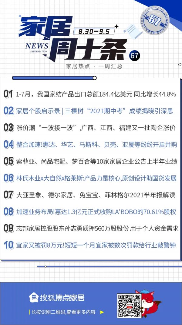 家居周十条|家纺前7月出口额增44.8%、宜家8月份三次被罚