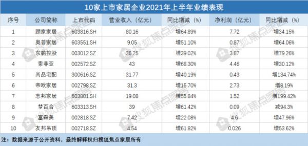 近日,顾家家居、奥普家居、东鹏控股、索菲亚、尚品宅配、帝欧家居、志邦家居、梦百合、富森美、友邦吊顶等10家家居企业发布2021年上半年半年度报告。