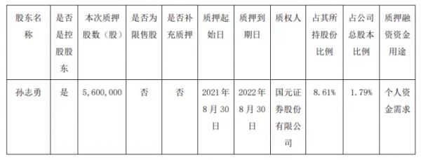 9月3日,志邦家居(603801.SH)发布关于大股东股票质押及部分股份解除质押的公告,昨日控股股东孙志勇将其持有的本公司560万股股票进行了质押,2021年8月30日开始质押,2022年8月30日质押到期,占其所持股份的8.61%,占公司总股本的1.79%,用于个人资金需求。