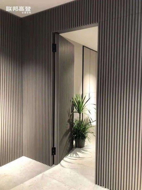 隐藏于木格栅的隐形门适用于较为浅窄的家居空间,其更像是一款屏风或者隔断,为室内营造一种隐约的朦胧美。格栅由于其独特的线条,可营造出轨道隐形极简视觉,达到“隐藏”“隐形”的视效。