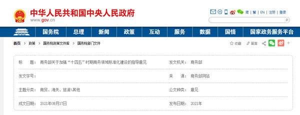 8月19日,商务部发布《关于加强“十四五”时期商务领域标准化建设的指导意见》,意见指出,标准化是商务工作的重要基础,是引领行业发展、规范市场秩序、推动流通变革、促进消费升级的技术支撑,对畅通国内大循环、促进国内国际双循环,引领商务高质量发展、高水平开放具有重要意义。