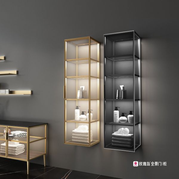 2021年,玫瑰岛开启高端柜类收纳的跨界之旅,在2021上海厨卫展首度亮相全新品类——全景柜。作为玫瑰岛首创的柜类收纳“新物种”,全景柜门板以玻璃为主,通体晶莹通透、收纳视野无阻,既能分隔空间,提升空间使用率,又具有强大的收纳功能,配备见光不见灯的LED灯光系统,打造简奢的现代生活空间。