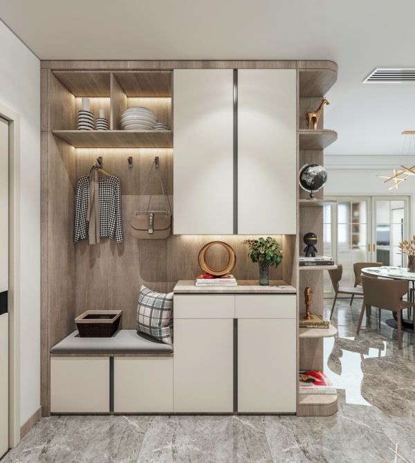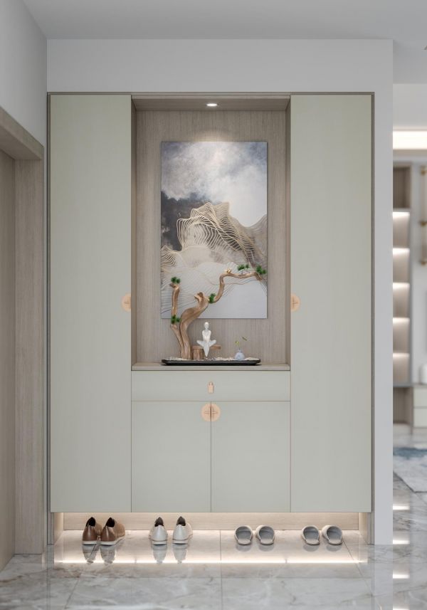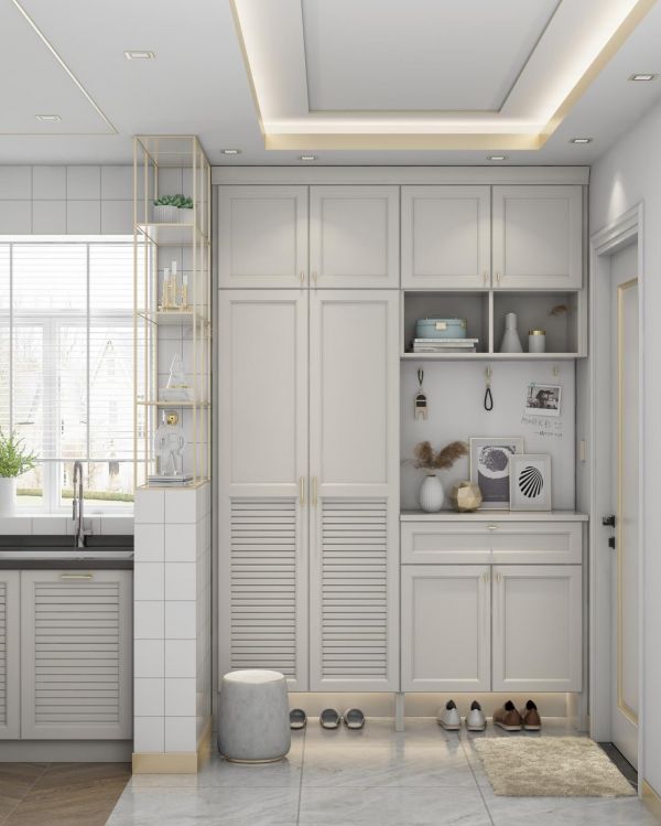 想要更大的储物空间,建议定制顶天立地式玄关柜,并且注重功能分区。设置衣帽悬挂区、物品展示区、杂物收纳区以及鞋柜四个基本的功能分区。