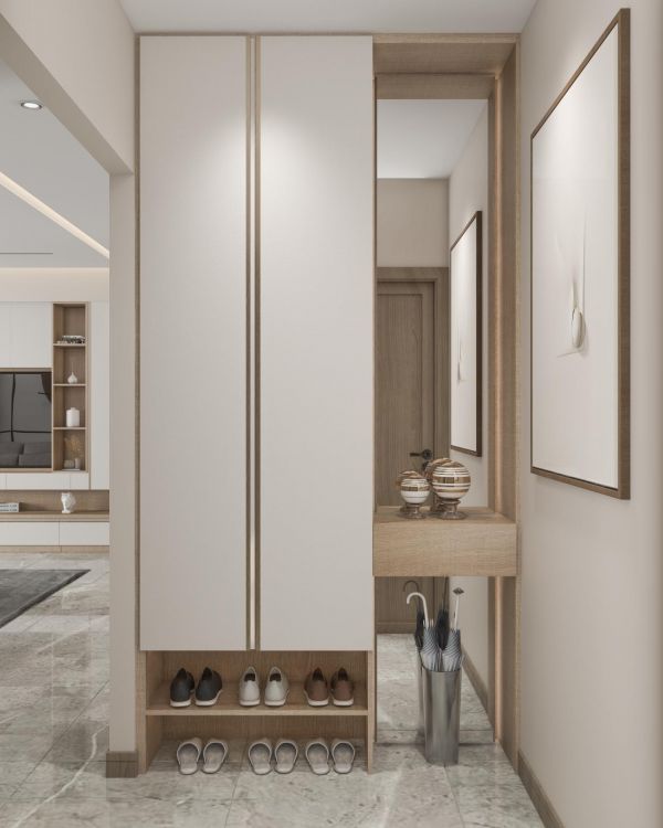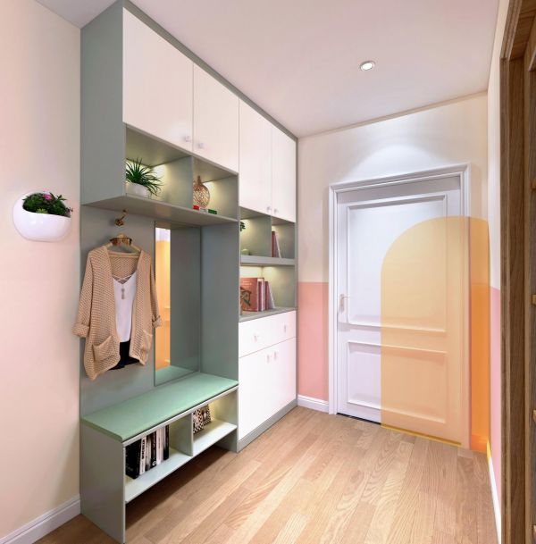 这类户型设计的时候就规划出了玄关的位置,这种时候只需要直接在墙面定制喜欢的玄关柜类型就可以了,不用过多费心去规划设计玄关柜所处的位置。