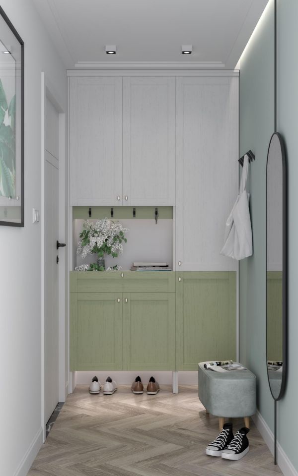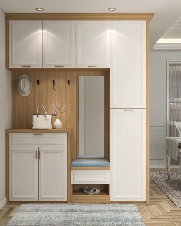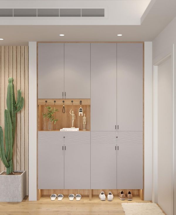 鞋柜底部建议留15—20厘米的空白,便于日常换鞋,不用费力翻找,提高出门效率。也给平时的清扫减轻难度,方便扫地机器人打扫。