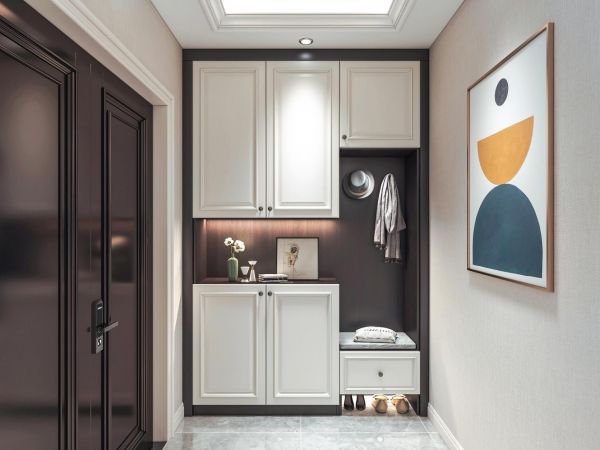 因为玄关这个空间位置的特殊性,所以在玄关柜门的选择还是最好采用封闭式掩门柜设计,将日常杂物收纳于柜中,保证私密性的同时玄关更显整洁有序。