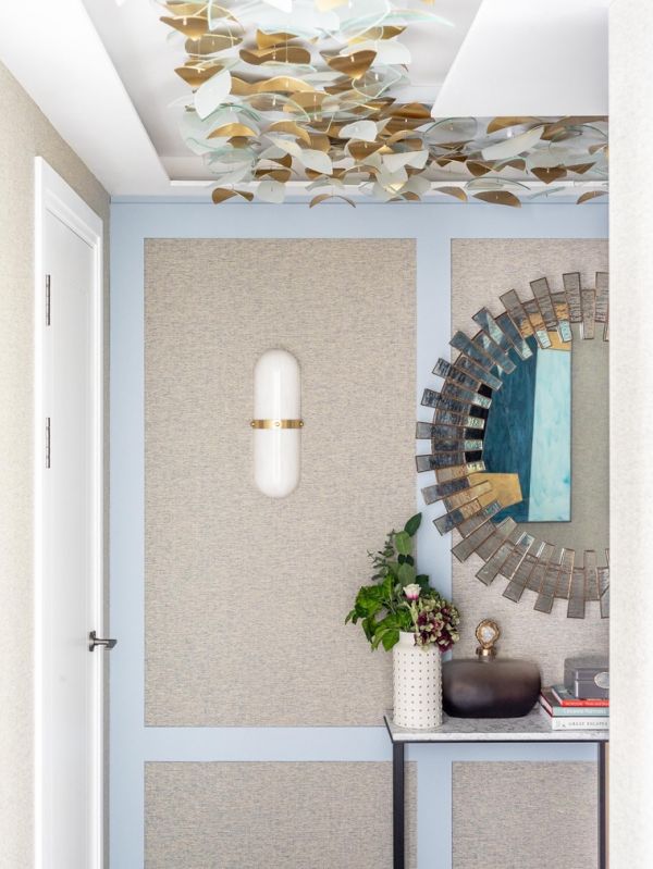 玄关走廊的特色墙由浅蓝色镶板组成,镶有高端品牌Arte定制的比利时特色编织墙纸。烛台式的壁灯让人联想到航海灯并唤醒对蔚蓝大海的期盼。客厅的吊灯由三个拉丝黄铜环组成,饰有珍珠母贝盘,给人栩栩如生的感觉。