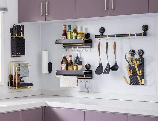 太力新品置物架采用磨砂黑金双重喷漆技术,质感更细腻、更高级。在外观创新的同时,太力新品还做了功能性的延展,推出太力抹布沥水架、太力刀架、太力锅盖架、太力厨房调料架等一系列黑金质感的太力厨房收纳用品,为消费者营造空间高级感,给家居生活增添一种轻奢质感。