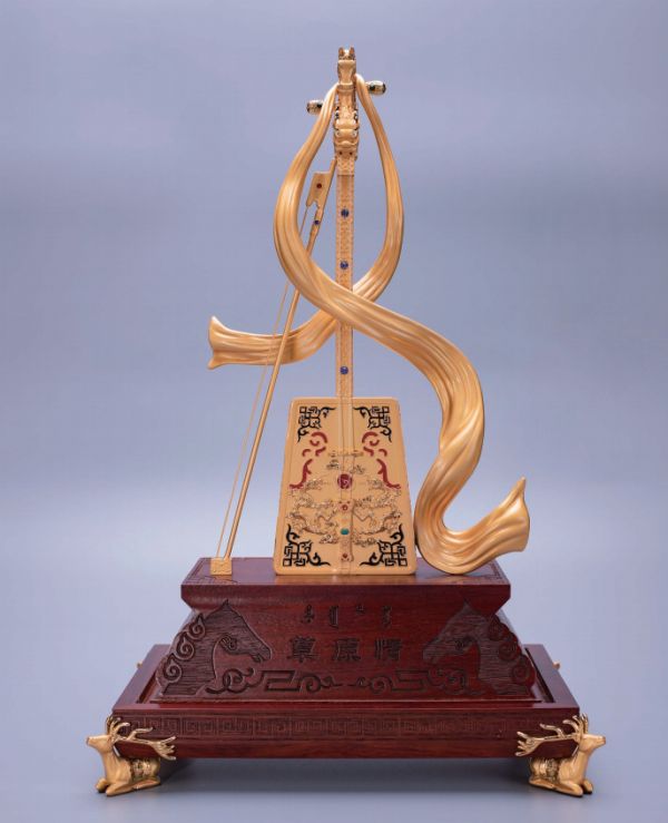 荣朝(内蒙古)文化产业有限公司带来的艺术收藏品《草原情》琴体以16套精密钢模压制而成,主体电镀双色真金,纯手工琴箱滴黑、红、蓝色油,并镶嵌87颗施华洛世奇水钻、松石,底座采用花梨木手工雕刻而成。不管是收藏鉴赏、馈赠朋友,都是不可多得的艺术珍品。