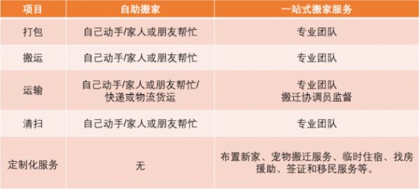 各搬家公司能够提供的服务不尽相同,常规服务包含:打包、搬运和运输。而一站式搬家,除了常规服务外还提供定制化服务,例如布置新家等。