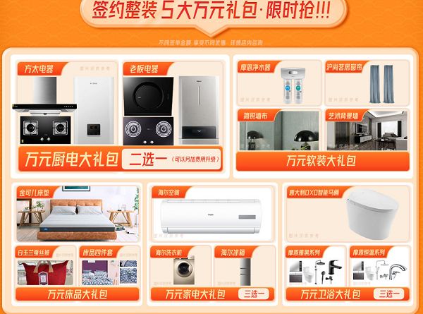 99周年庆活动期间,沪尚茗居联合众多品牌家居推出5大万元装修礼包,将厨电、软装、床品、家电、卫浴各类装修建材一网打尽。老板、方太、摩恩、海尔、金可儿...多个品牌家居联手让利,优惠大放送,将宠粉进行到底。