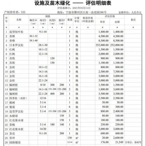 该庭院里的绿化苗木包含造型短叶松、香樟、日本罗汉松、红枫、苏铁、金桂、榆树桩、四季桂、造型罗汉松、红花继木桩、茶花等不同规格品种。其中一株日本罗汉松评估价就高达25万余元。