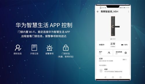 青稞N5H支持HUAWEI HiLink,用户通过华为智慧生活 APP,可以实时查看门锁状态和信息、查询开锁记录;亲朋好友突然来访,可以在智慧生活APP创建临时密码;还能与HUAWEI HiLink生态产品联动,自由定制智慧生活方案。