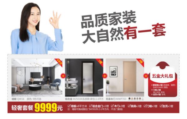 在10周年大型促销季期间,为了大家能在选择定制家居时省时省力更省钱,大自然门墙优惠升级,推出全屋9999元轻奢套餐。套餐计价更透明、更划算,简洁便捷。