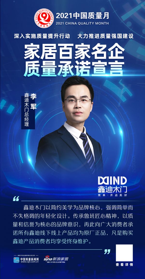 鑫迪木门质量承诺宣言:以简约美学为品牌核心,强调简单而不失格调的年轻化设计。传承鲁班匠心精神,以质量和信誉为核心的品牌意识,再此向广大消费者承诺所有鑫迪线下线上产品均为原厂正品,凡是购买鑫迪产品消费者均享受终身维护。