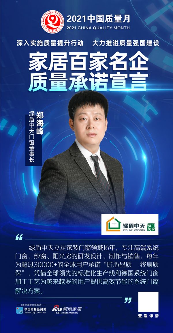 绿盾中天质量承诺宣言:立足家装门窗领域16年,专注高端系统门窗、纱窗、阳光房的研发设计、制作与销售,每年为超过30000+的全球用户承诺“匠心品质 终身质保”,凭借全球领先的标准化生产线和德国系统门窗加工工艺为越来越多的用户提供高效节能的系统门窗解决方案。