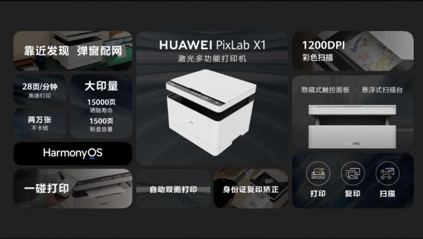 此次发布的新品中还包括了一个全新的品类:打印机。首款搭载HarmonyOS的打印机HUAWEI PixLab X1是华为在智慧办公领域、全场景体验中的一步新的关键布局,赋予用户全新的打印使用体验。用户只需将开启蓝牙的华为手机、平板、PC靠近打印机,根据屏幕弹窗的提示即可快速实现设备和打印机的连接,最快仅20秒即可完成配网操作。此外,PixLab X1在打印操作方面也做到了简洁高效,为用户提供了全新的一碰打印,让每一个人都能享受更简单、更智慧的科技。