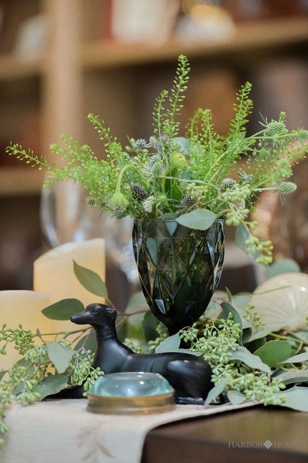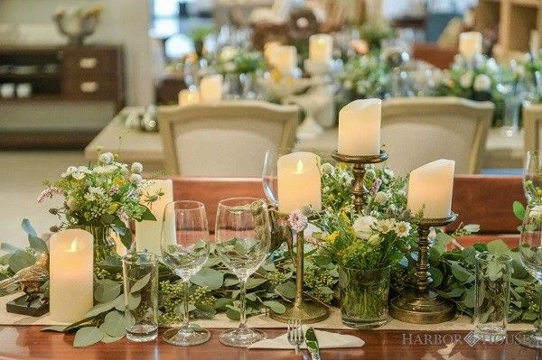 透明或金属质感的杯具和烛台,搭配有芬芳气味的尤加利叶子铺设在桌旗上,再利用蜡烛进行挑高……通过搭配烘托餐桌上自然温馨的气氛。