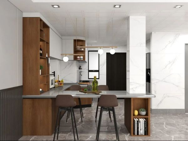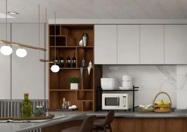 吧台台面靠墙处配备酒柜设计,可以存放酒具也可收纳陈列一些精美的艺术摆件,同时与白色吊柜相接,视觉上更美观大气。