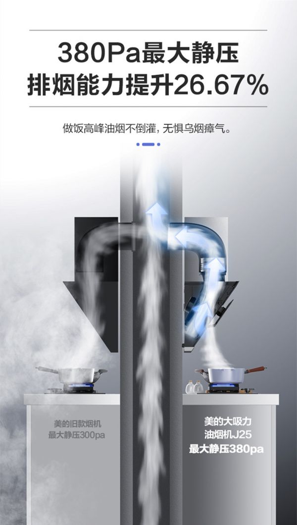 美的大吸力油烟机J25拥有20m³/min飓风大吸力0.7分钟*换新厨房,尽情爆炒油烟不沾身,瞬吸浓烟重油,爆炒辣椒不呛鼻,让您大热天也能清爽下厨。三档风量:弱档——日常蒸煮;强档——煎炸小炒;爆炒档——猛火爆炒,操作省心。四维立体环吸,云板设计,四周进风,提升负压面积,吸排效果惊人,油烟无外溢,拢净油烟不扑脸。380Pa最大静压排烟能力提升26.67%,让您做饭高峰油烟不倒灌,无惧乌烟瘴气。它的开机即启动上次记忆挡位,方便老人使用。导流板易拆设计能够轻松清洁不藏污。