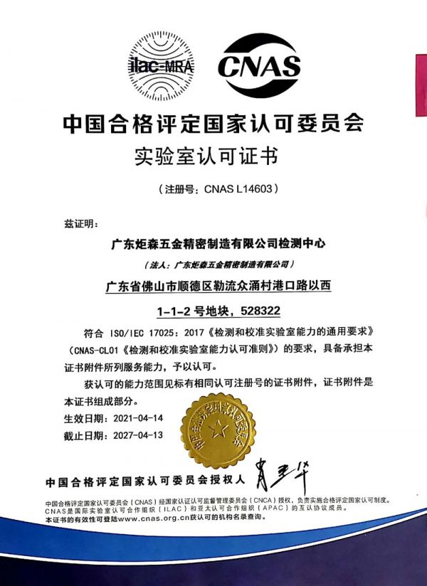 炬森五金检测中心获得中国合格评定国家认可委员会(英文简称CNAS)认证证书,一举跻身国家认可实验室的行列。