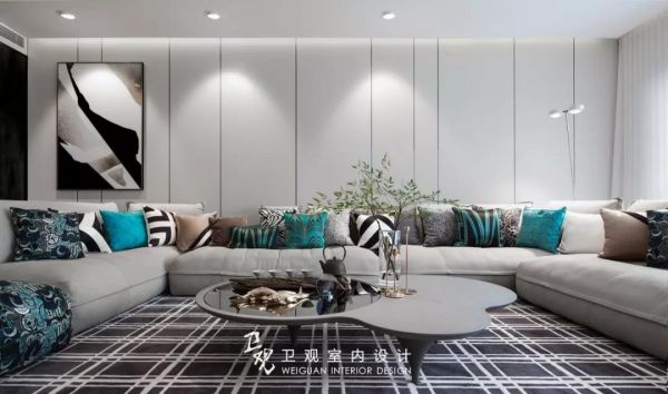 在色彩使用上,客厅色彩搭配不宜超过三种颜色。指的是除了黑白两色外,同一个相对封闭空间内,大面积的颜色运用最好不超过三种,这样可以保证空间颜色的统一,避免杂乱。当然为避免单调,小面积可以使用多种颜色,注意适当的比例即可。