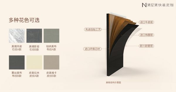 美板通过引进日本农林JAS公认的F4星环保板材技术,经过特殊处理的坚硬表面结构和封边技术,完美呈现出“高颜值、真安全、超耐用”三大优越产品性能,充分满足用户个性化家居需求,是环保、安全和耐用的首选板材。