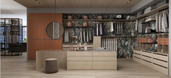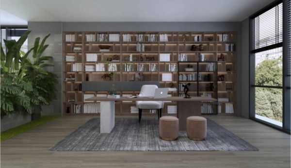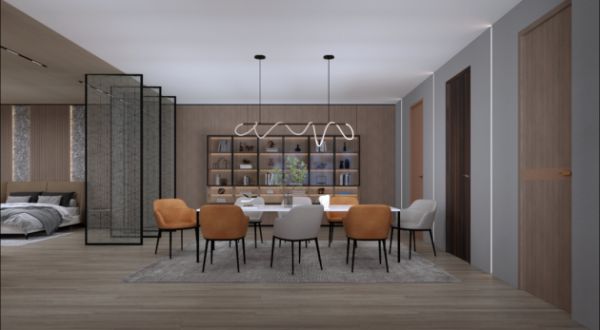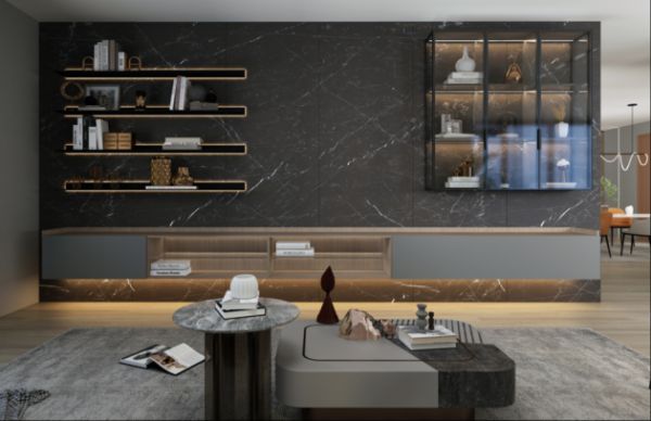 岩板、木饰面、皮质等多元材质之间的肌理碰撞