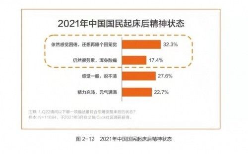《白皮书》数据显示:仅有22.7%的国民在睡醒后感到精力充沛;有超过30%的国民表示起床后仍有困倦感,还想睡个回笼觉;17.4%的国民表示仍然很劳累,浑身酸痛。从数据上可以看出国民睡眠质量令人堪忧。