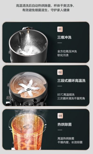 美的免手洗破壁机就帮你打消了这些顾虑,真正实现了“自动洗 只管喝”的美好愿望。机身小巧美观,而且采用全自动智能清洗程序,全方位高压冲洗杯体,如滚筒洗衣机一般高速搅洗,再难洗的污渍都会顶不住“压力”,再是三次循环高温洗,然后会热烘干燥除菌,防止细菌滋生。清洗后的干净程度可以用一句话来形容,那就是比我手洗还干净。