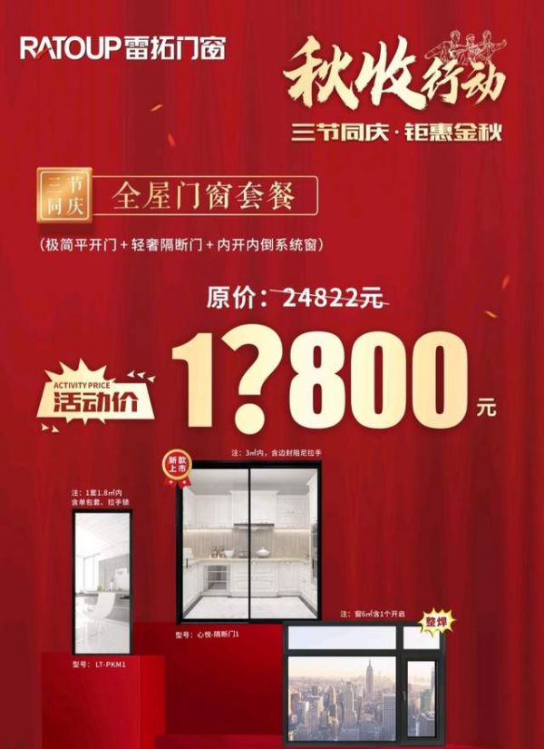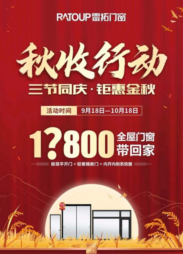 为迎接2021年中秋、国庆、周年庆,国内知名门窗品牌雷拓门窗特推出“三节同庆”优惠活动。雷拓门窗“三节同庆”优惠活动。主要通过推出门窗套餐化方案让利消费者。活动周期长,优惠幅度大,品牌公信力强。可谓诚意献礼,谨贺佳节。
