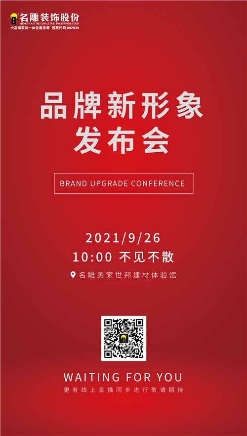 名雕装饰股份在家装行业中不断成长与发展,始终不变的是以用户的需求为核心,围绕“家”主题不断打造提升人们生活品质的居所环境。此次品牌新形象发布会将面向全行业与用户,诠释品牌新形象并举行新LOGO揭幕仪式,届时,行业协会领导、企业高层、权威媒体、特邀嘉宾、供应商代表、业主代表将汇聚一堂,共同见证名雕装饰股份品牌焕新时刻。除此之外,名雕装饰股份还将发布品牌重要战略方向,更多重磅内容,敬请关注。