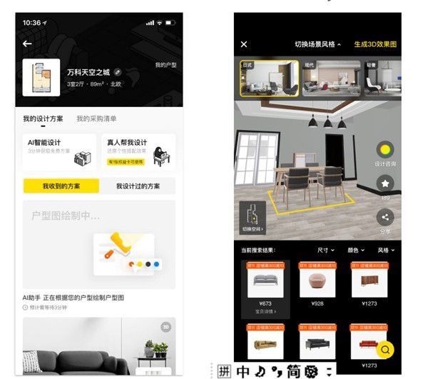 除此之外,每平每屋设计家AI智能设计出的3D设计方案,所有方案中软装、硬装的3D商品模型均与平台真实商品绑定,支持消费者在淘宝或天猫和每平每屋平台实现一站式购买,将心动的家居搭配方案在自家还原,消费者所见即可所得。