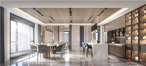 餐厅的木色栅格门颇具年轮感,且巧妙的将餐厅与客厅划分开来;开放式的西厨、吧台和餐桌相互呼应;一整面墙的香槟金到顶柜,既能收纳日常喜欢的红酒和酒具,又营造出浪漫轻奢的氛围感;木色吊顶和简约时尚的吊灯相应成趣 。