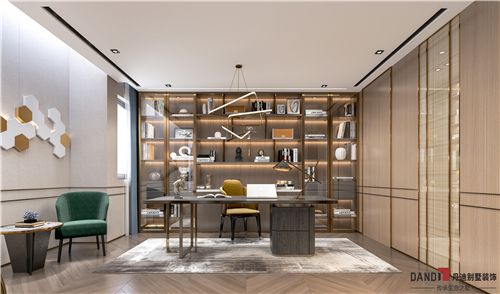 书房一整面的到顶书柜彰显出业主丰厚的学识和文化底蕴。草绿色的单人沙发椅将书房的传统风韵与现代舒适感完美融合;室内桌椅疏密有度,体现出空间整体的合理性;时尚的灯饰增加空间的层次感;整体营造出古朴、素雅的阅读空间。