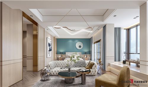 现代轻奢风的主卧,满溢浪漫的氛围感,充满艺术情调。设计师将象征爱与美的蒂芙尼蓝作为床头背景,奠定了整体空间纯粹和清新灵动的视觉体验。白色吊顶、湖蓝色窗帘、香槟金色的软装和蒂芙尼蓝在这个空间完美融合。不仅具有高端沉稳的轻奢之美,还拥有宜人的色彩层次感,更有摩登的艺术情调。