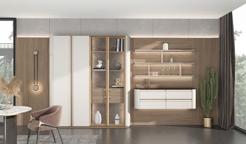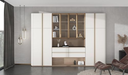 与入户柜相同,“奈斯”系列餐边柜同样采用了简单的一字型设计,由封闭柜体、玻璃柜、开放层板和吊柜组成,不仅收纳空间丰富,而且整体错落有致。