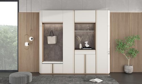 欧派全屋定制“奈斯”系列在入户空间的设计上突出自然、大气的风格,整个入户柜呈一字型,大片暖白色调搭配开放区黑色石纹背板,简约、温暖。同时,该系列产品门型全部都采用了长条包覆新工艺,侧板则一改以往的设计,以圆弧代替直角,从而解决了尖锐直角存在的安全隐患。