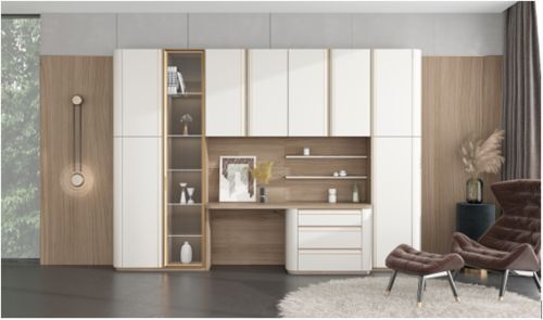 欧派全屋定制“奈斯”系列在书柜的设计上使用了多种布局的方式,更加方便不同体积物品的收纳。抽屉与吊柜的外观和谐统一,整体层次感鲜明。同时,为了营造远离喧嚣的宁静氛围,书柜以云石灰PVC膜的暖灰白色与千川木的木直纹相搭配,给人亲近自然的感觉。再加上金色拉手和几何图案背板,使书房空间更有品位。