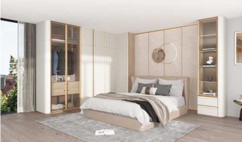 卧室衣柜的设计延续了“奈斯”系列整体的风格,采用通透玻璃柜与封闭柜的结合方式,在具备展示功能的同时还契合卧室的隐私要求。衣柜门板表面带有细腻的颗粒感,再加上经过哑光处理,触感上也会更柔和。衣柜与床头柜都以暖色调为主,使整个空间充满治愈力。