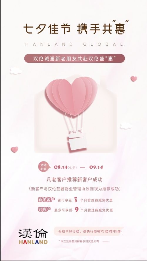 此外,汉伦七夕活动仍在进行中,诚邀广大新老朋友共赴盛“惠”。在8月14日至9月14日期间,凡老客户推荐新客户成功,新老客户均可享受优惠福利,新老客户皆可享受3个月管理费减免优惠,老客户最高可享受9个月管理费减免优惠,本次七夕活动时不可待,诚邀您来,详情可子在汉伦官网进行查询!