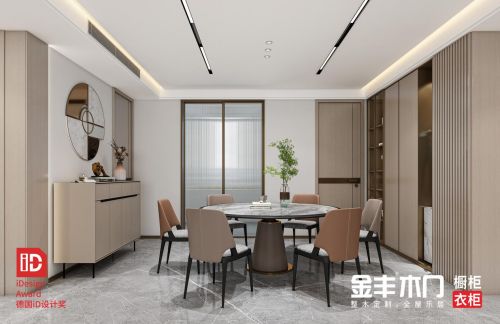 金丰懂设计,更懂生活。以时尚的角度诠释别样现代美学,定制您专属的韵味家居,打造高端家居生活。厨房的设计一面为整体设计的高柜,内嵌烤箱等用具,让空间整体统一,在注重写意情怀的同时,注重实际使用功能,收纳、储藏灵活运用,搭配随心。
