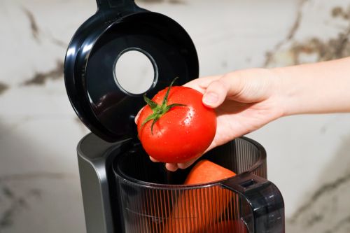 3、将食材投入料斗并合上盖。开始榨汁。