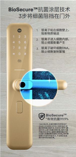 耶鲁在Helios S上首次运用了BioSecure™抗菌涂层技术。在不影响手感和外观的基础上,涂层上的银离子可强力抑制包括大肠杆菌在内的多种细菌。BioSecure技术镀层安全无毒,在正常使用条件下长期有效、不会脱落,从而使抗菌功能长效持久。如有细菌或微生物落在把手上,只需20-30分钟就可以被消除干净。